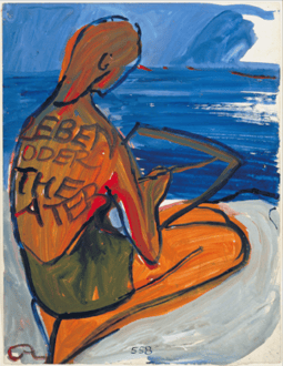 | This work is the concluding page of Charlotte Salomon’s principal work Life? or Theatre? The final gouache harks back to the text that begins the work describing Salomon sitting beside the sea painting. A tune enters her mind and she starts to hum it. As she hums, she realizes the tune matches what she is painting…Salomon completed the work at the Hotel “Belle Aurore”, Saint-Jean-Cap-Ferrat in summer 1942 (the proprietor later recalled her humming while she worked). |